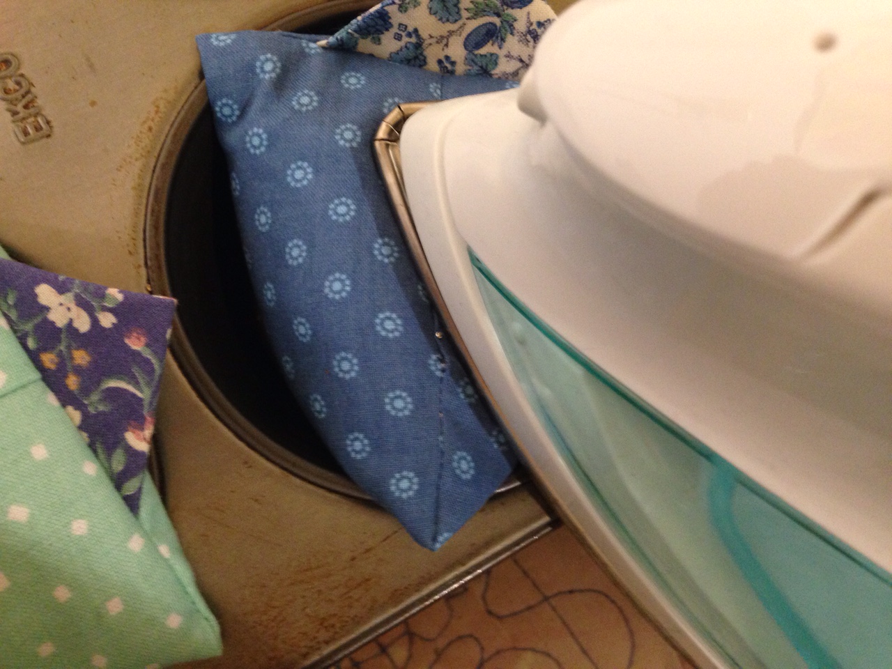 11. Insert your scrap of fusible batting/batting and a scrap of fusible between the walnut shells and the seam you are about to close. Chickenbattingstuffing