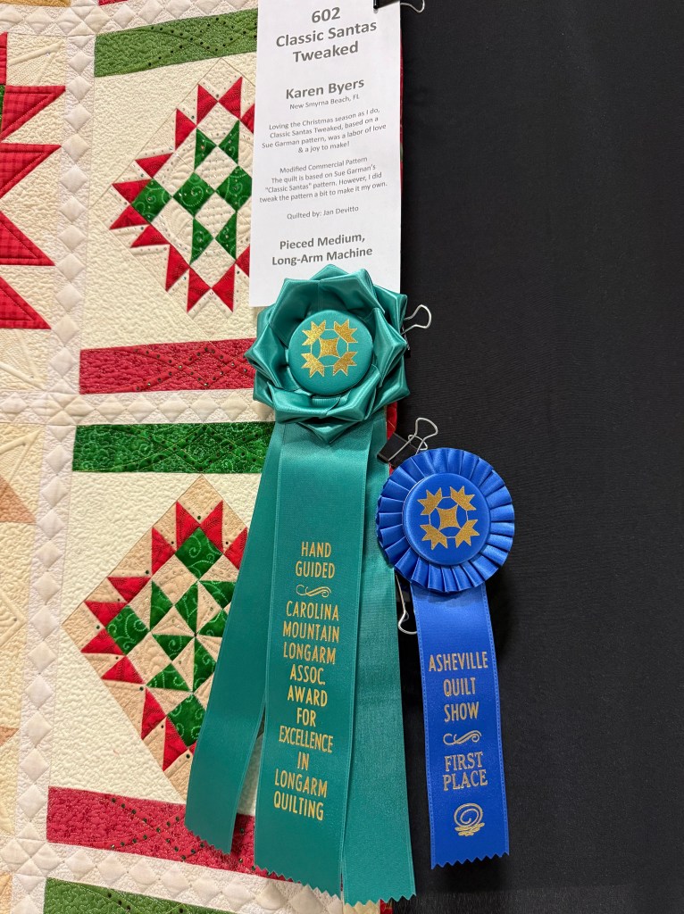 Longarm Quilter Ribbon Awards – Carolina Mountain Longarm Association has collaborated with the Asheville Quilt Guild to support and highlight the artistry of the quilter, an essential partner in the creative process. As you know, the one person or group who makes and owns a quilt may or may not be the same person who quilts it. CMLA is pleased to support the work of exceptional long arm quilters by awarding three ribbons at the Asheville Quilt Show. Teal Rosette ribbons were awarded to the long arm quilters for Excellence in Long Arm Quilting in the categories of Long Arm Quilted Hand Guided, Long Arm Quilted Computerized, Long Arm Quilted Combined Hand Guided and Computerized techniques. Many thanks to the members of the Asheville Quilt Guild who have paved the way for this process by modifying the entrance forms to identify long arm quilting for other categories, and for participating in making ribbons available.