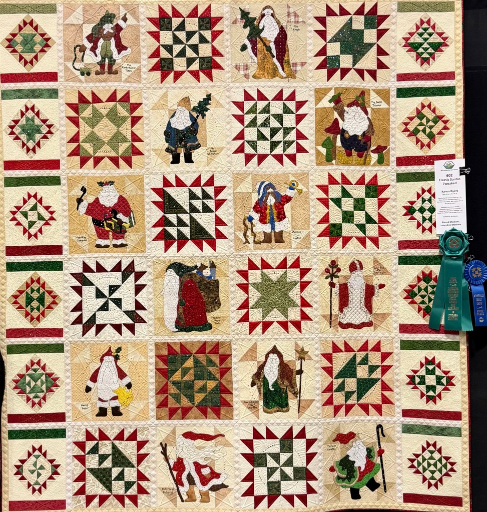 Classic Santas Tweaked: Karen Byers of Smyrna Beach, FL (Quilted by Jan DeVito), was awarded the Ribbon for Excellence in Longarm Quilting, Hand-Guided