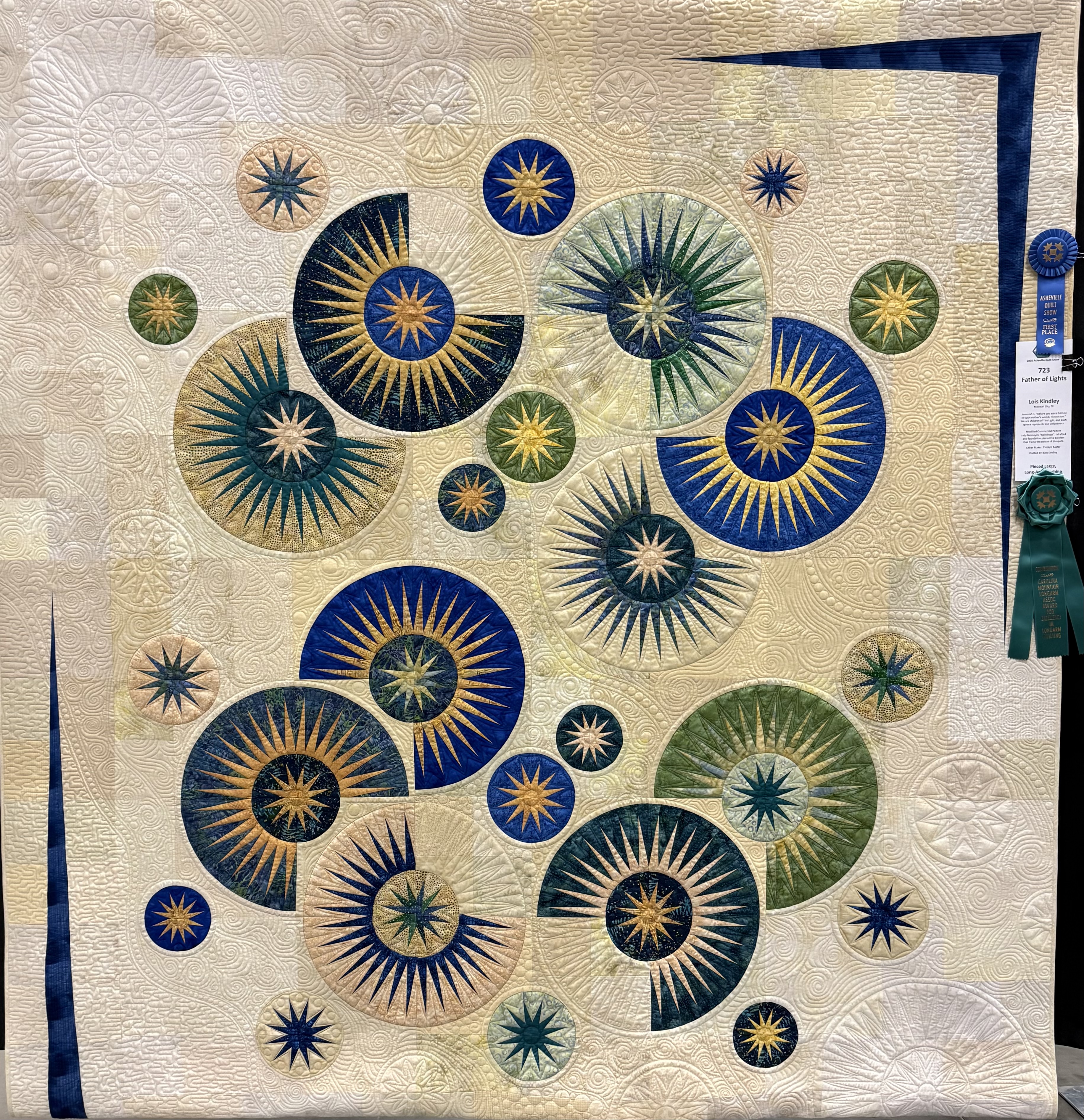 Father of Lights: Lois Kindley of Missouri City, TX was awarded the Ribbon for Excellence in Longarm Quilting, Combination (Computerized and Hand-Guided)