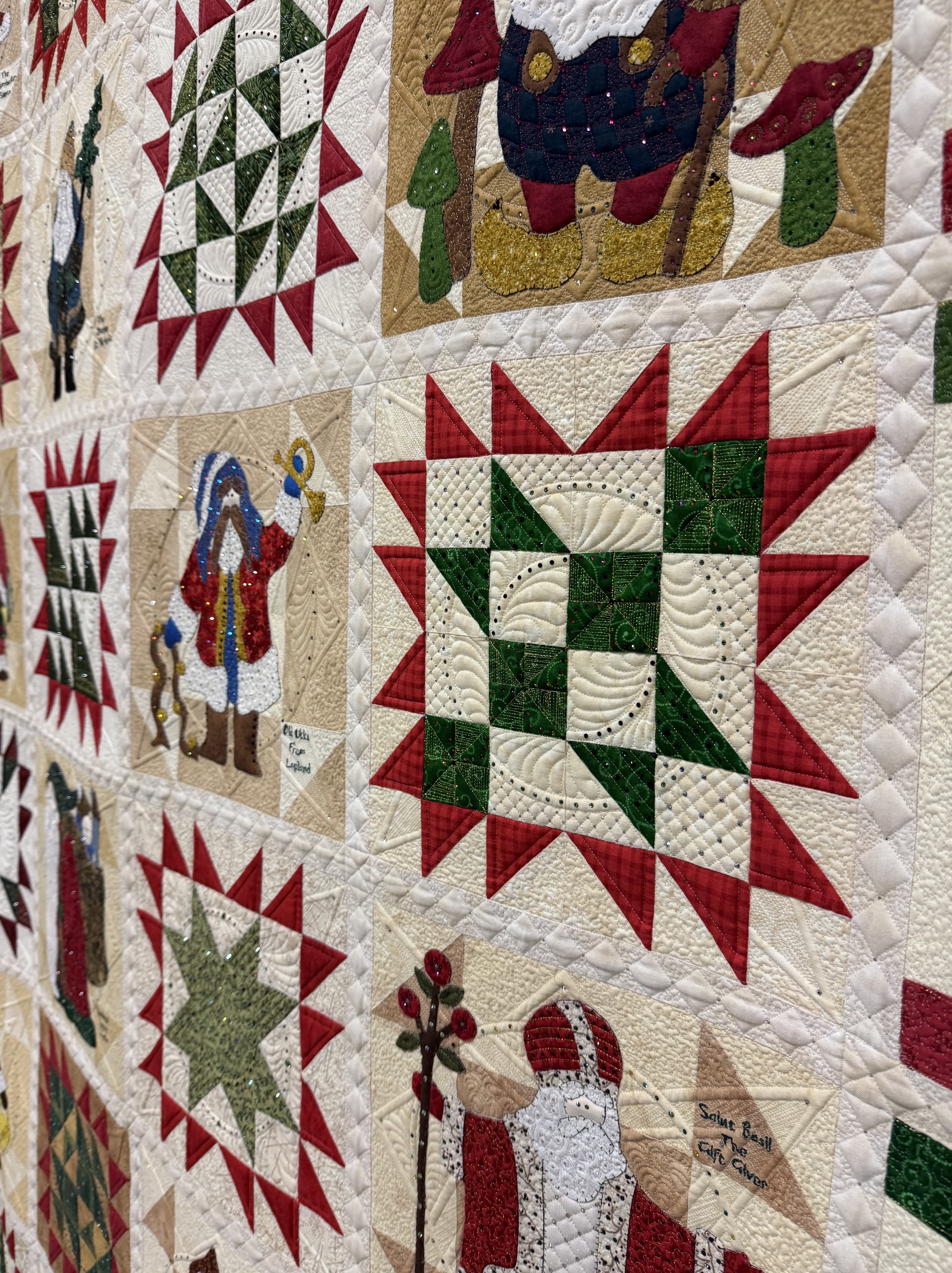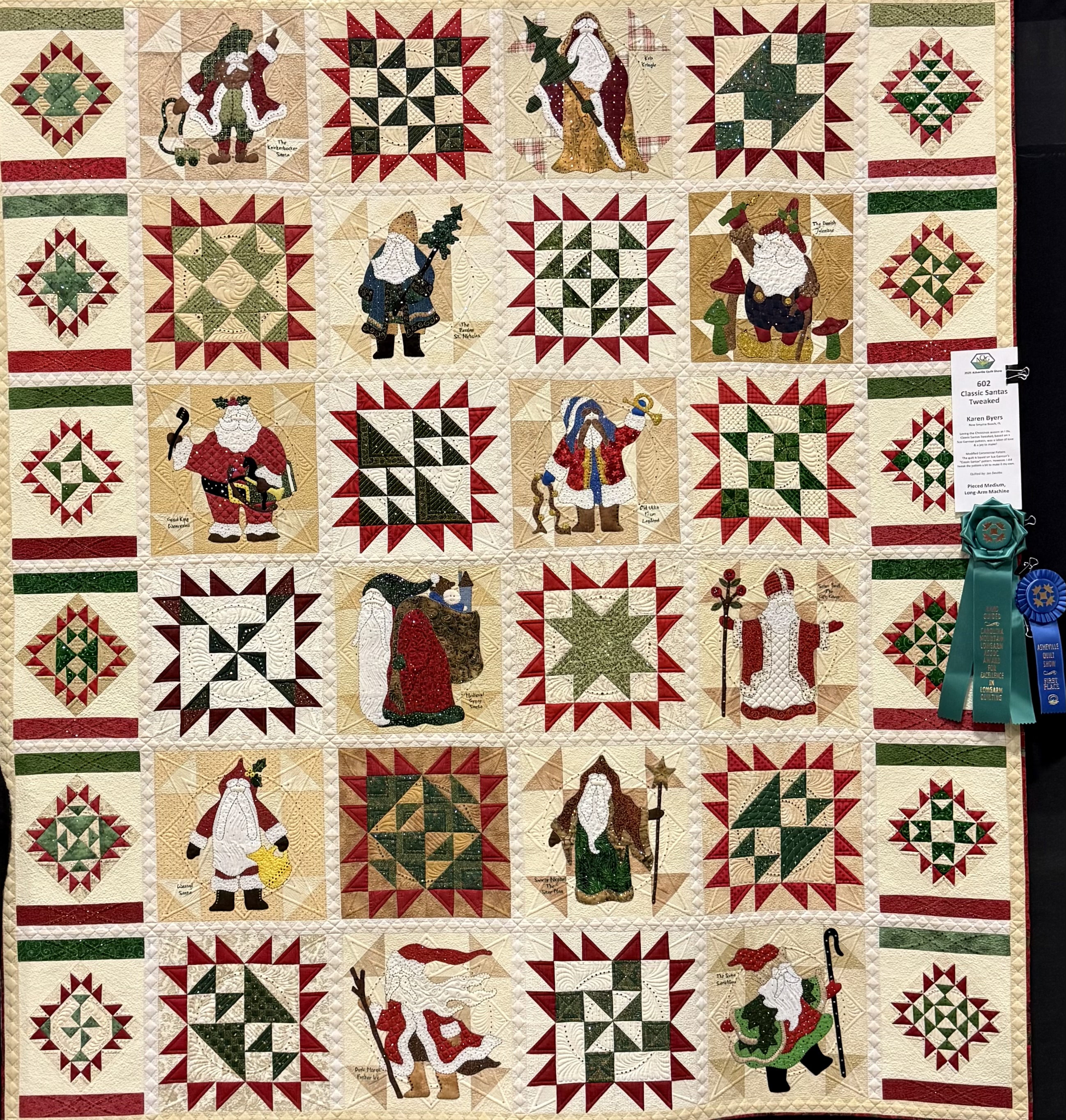 Classic Santas Tweaked: Karen Byers of Smyrna Beach, FL (Quilted by Jan DeVito), was awarded the Ribbon for Excellence in Longarm Quilting, Hand-Guided