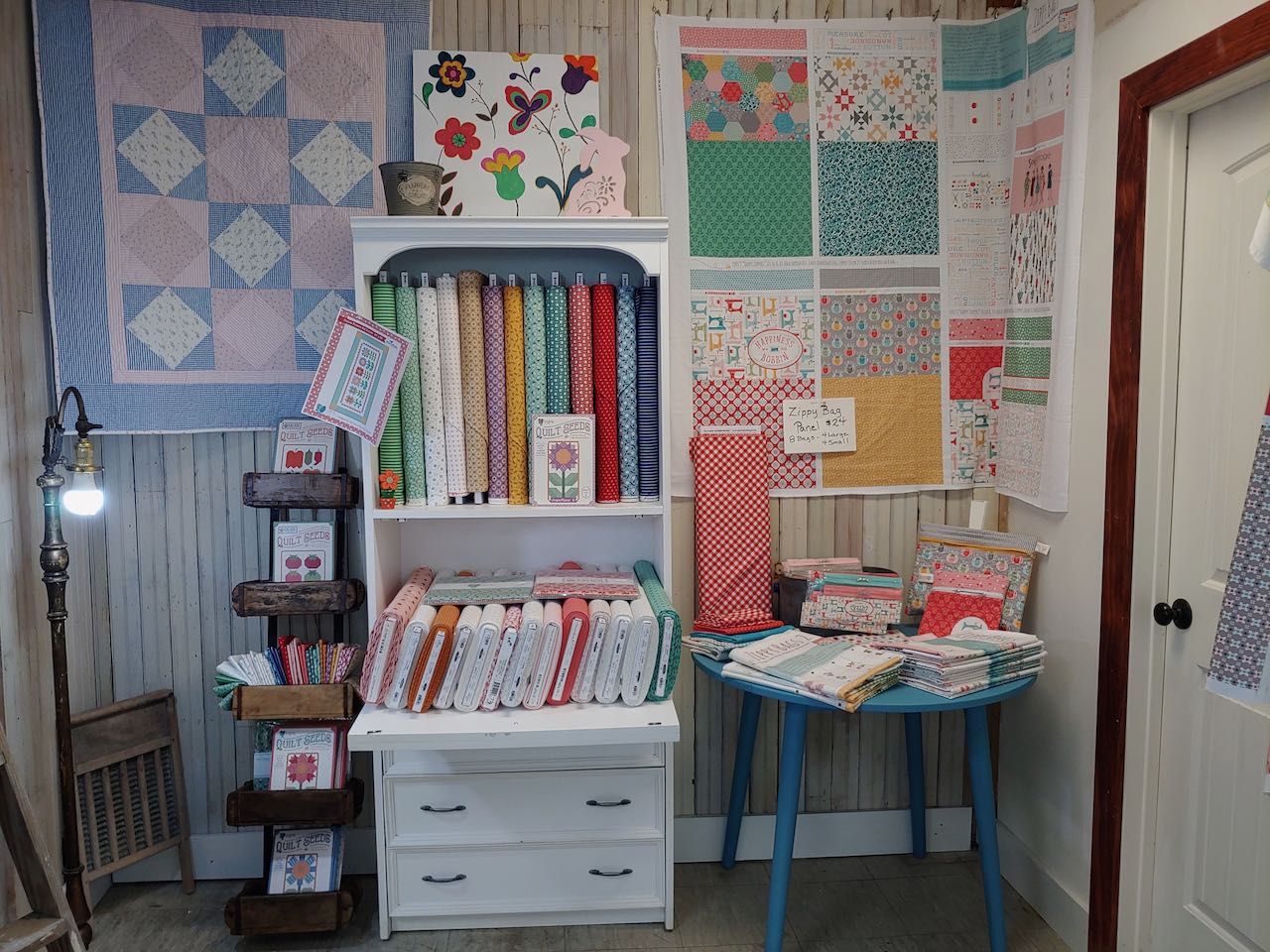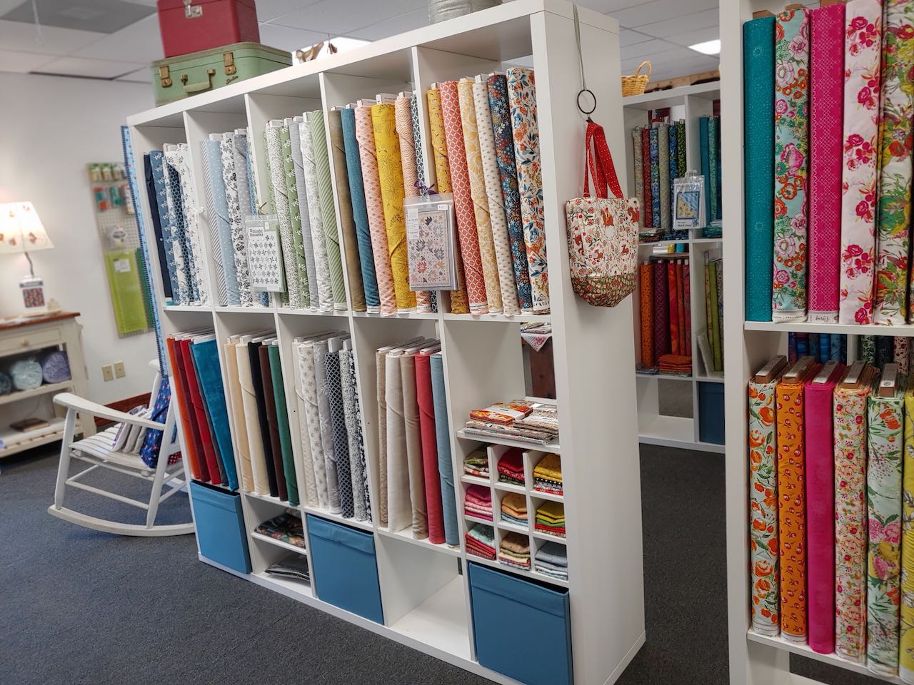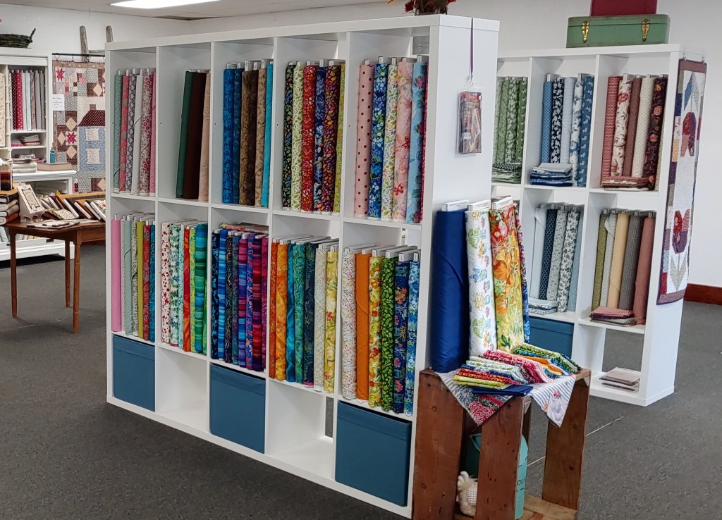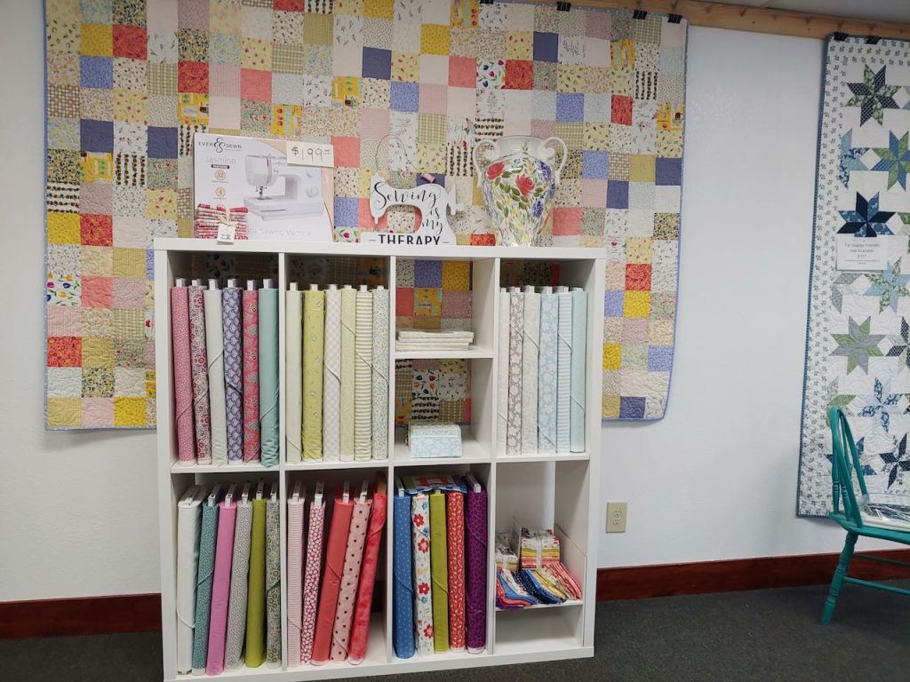 I carry Moda, Riley Blake, Henry Glass, Figo, Northcott and Art Gallery Fabrics. Pre-cuts are available in some collections. I carry 50wt Aurifil sewing thread in a variety of colors, Heat and Bond by the yard, a few colors of 2 yard cuts of Cuddle Luxe, Quilt Patterns, EverSewn Sewing Machines and a variety of sewing/quilting notions.