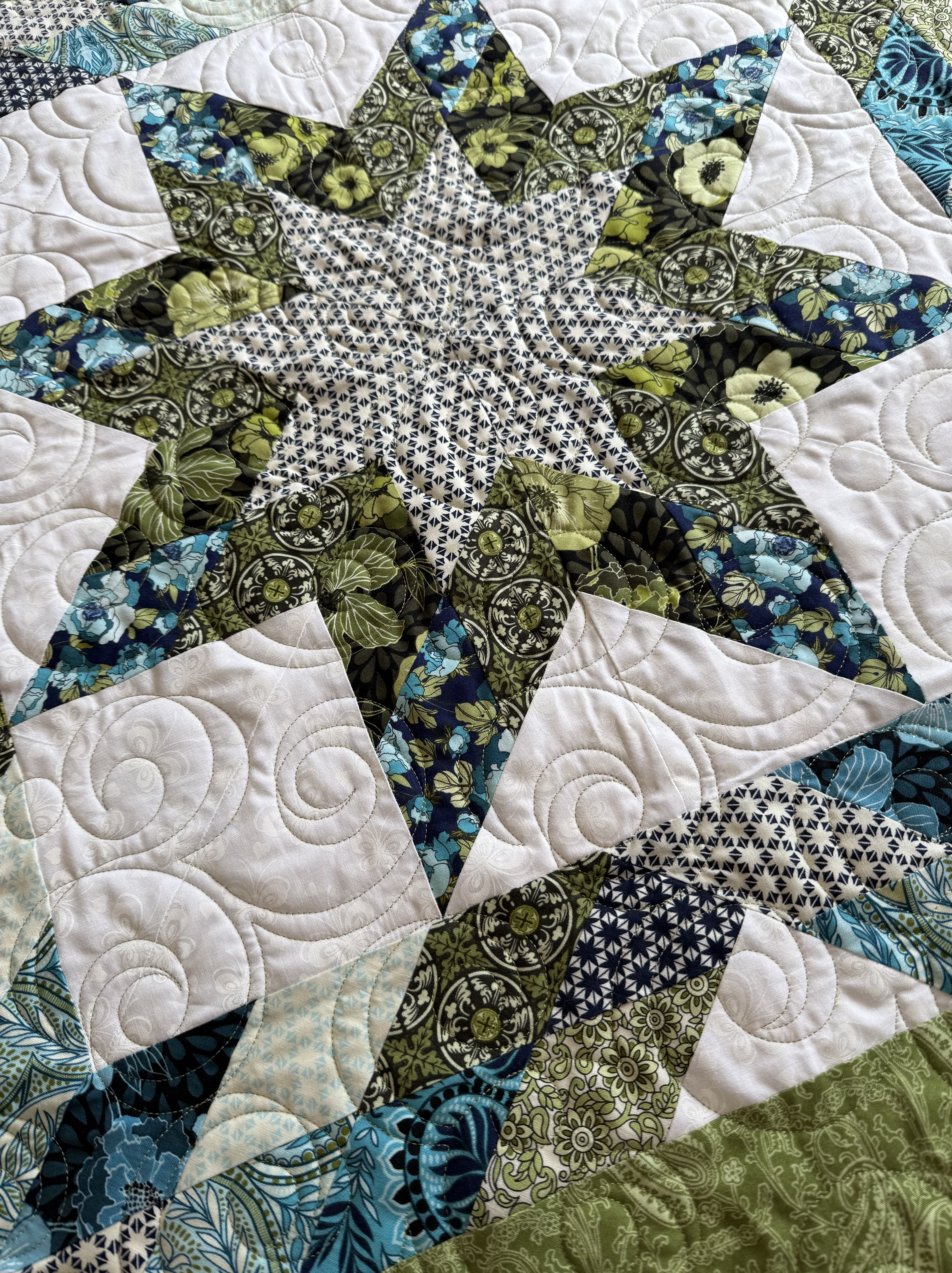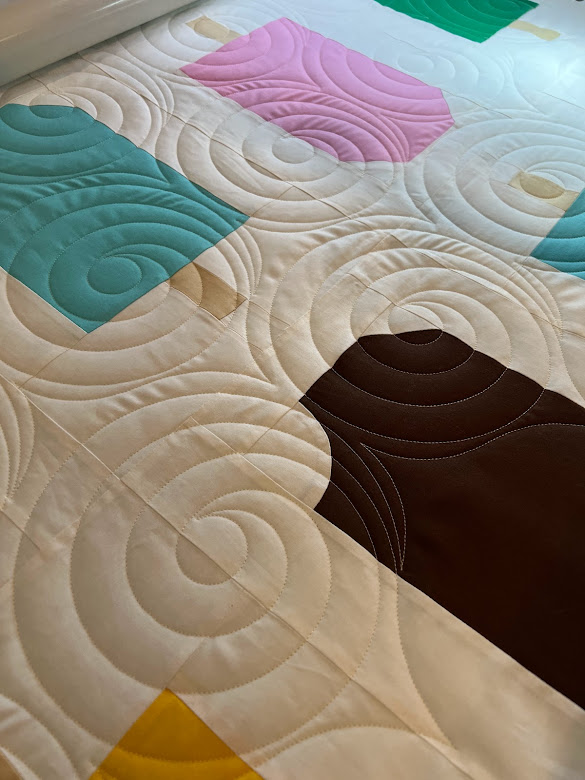 I have an APQS Lucey with IntelliQuilter, which has many designs. Together, we can choose a design pattern to compliment your piecing from simple and modern to ornate and traditional.